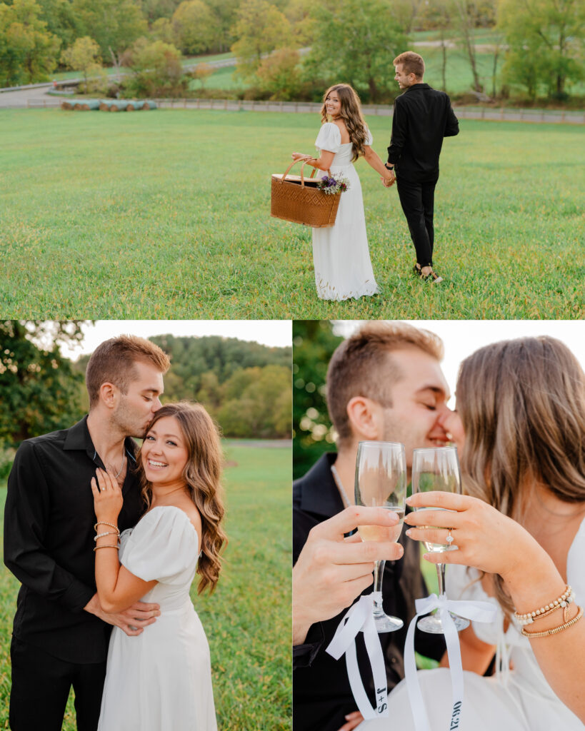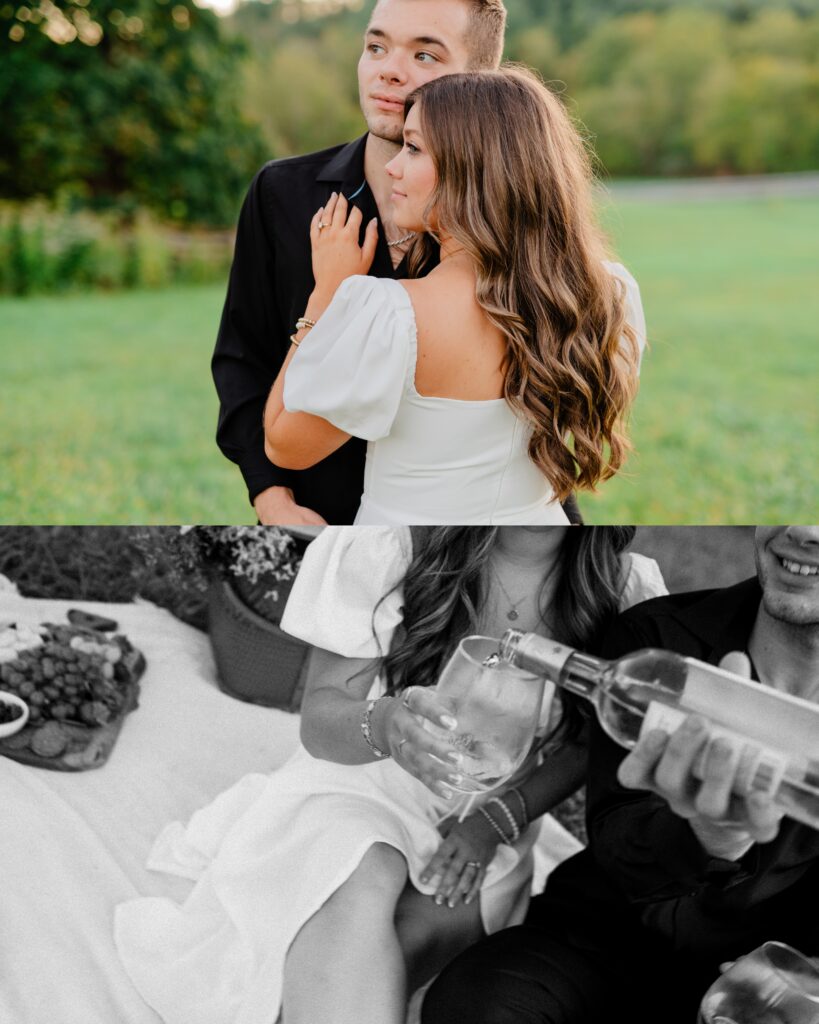 The way they walked hand in hand through the field, stealing glances back at each other. The laughter that came so easily. Champagne flutes clinking softly as the sun dipped lower in the sky. Every frame felt like a memory already—nostalgic in the best way, as if these photos could’ve been pulled from a story they’ll tell years from now.